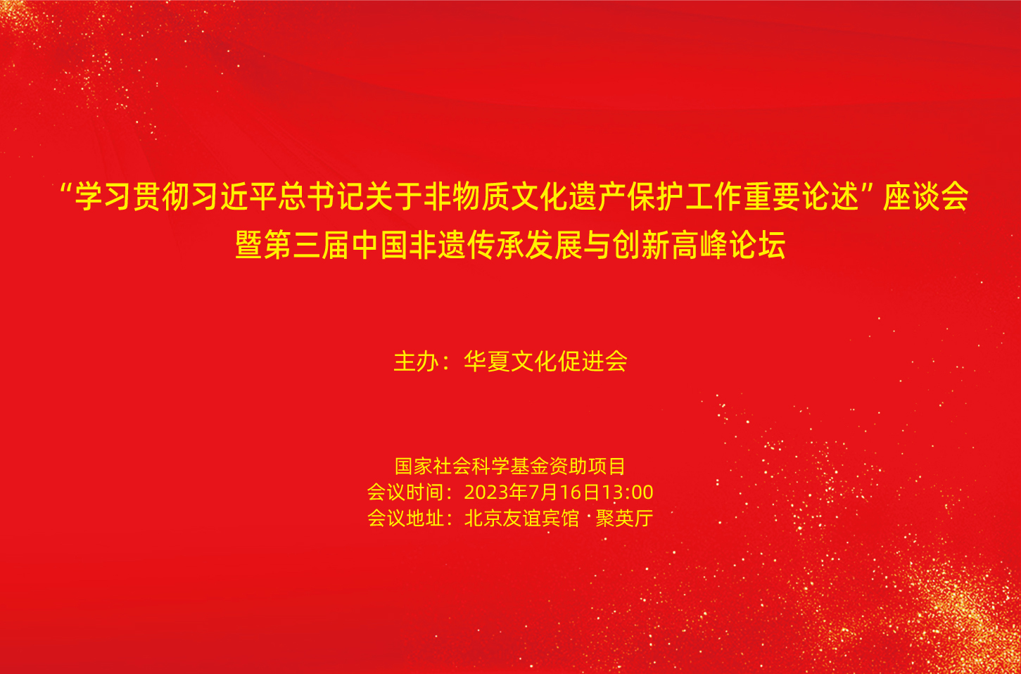 “學習貫徹習近平總書記關于非物質文化遺產保護工作重要論述”座談會暨第三屆中國非遺傳承發(fā)展與創(chuàng)新高峰論壇,將于2023年7月16日在北京友誼賓館聚英廳召開。本活動為國家社科基金資助項目。